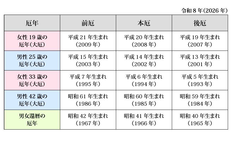 晴明神社では、厄年を数え歳の「男25歳・42歳・61歳」「女19歳・33歳・61歳」を本厄、その前後を前厄・後厄とします。